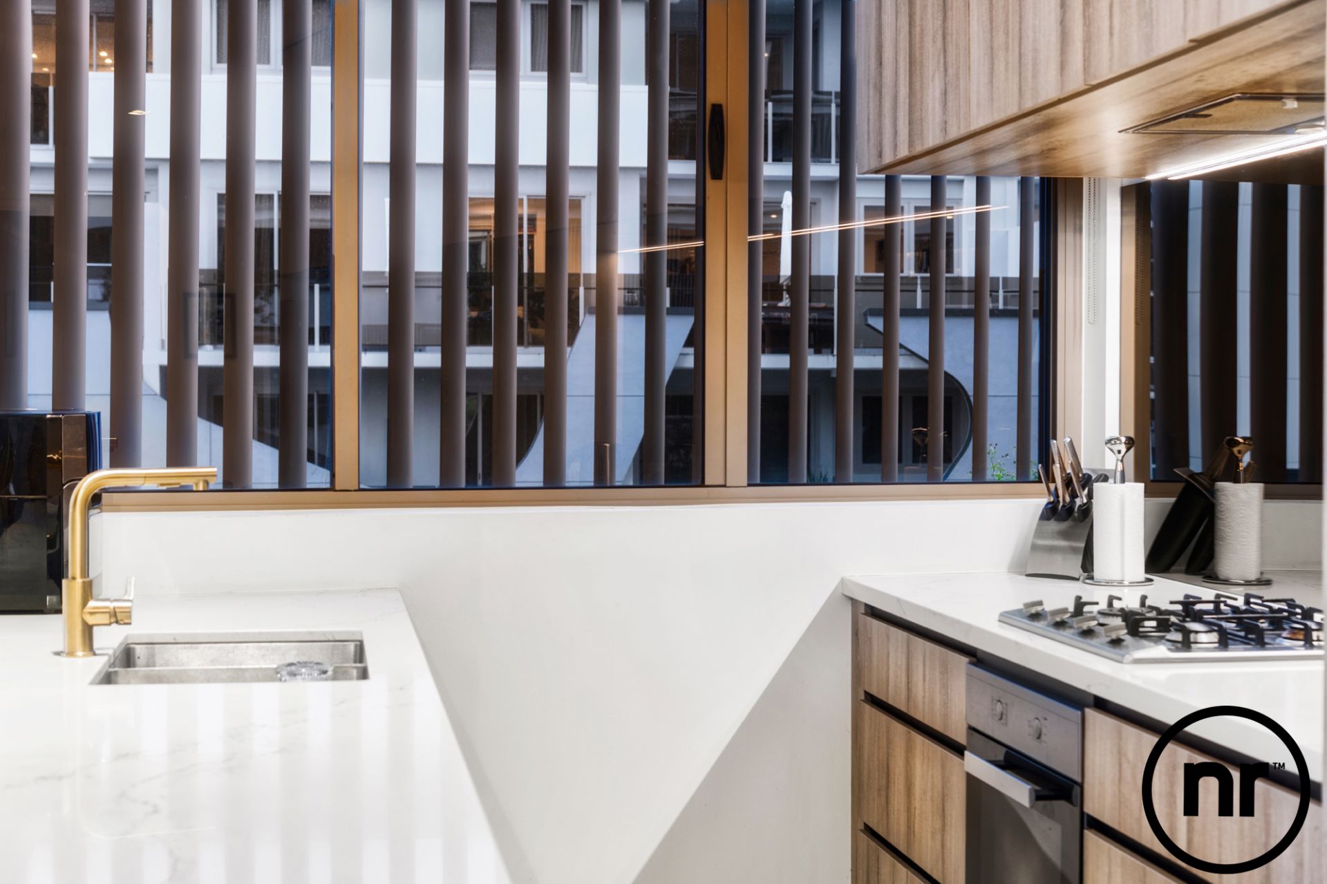 Walking down the entrance hallway and turning left, you’ll be instantly mesmerised by the expansive space under which several features sparkle. Acting as the centrepiece of the open-plan layout, a large penthouse sized white stone benchtop, upgraded Miele appliances, gas cooktops and gold tapware in the kitchen evoke opulence. Overlooking a wraparound winter garden, which is accessible via dual sliding doors, immerse yourself in a cohesive indoor and outdoor space.