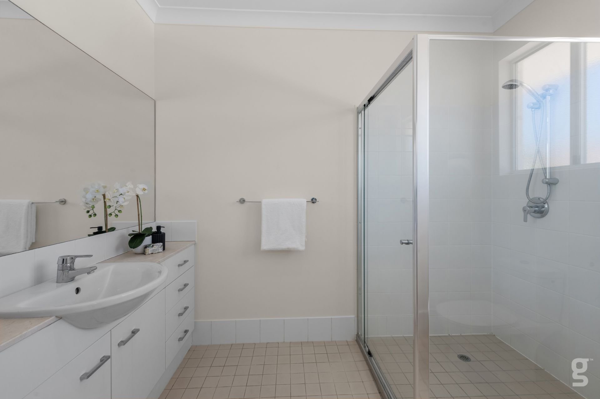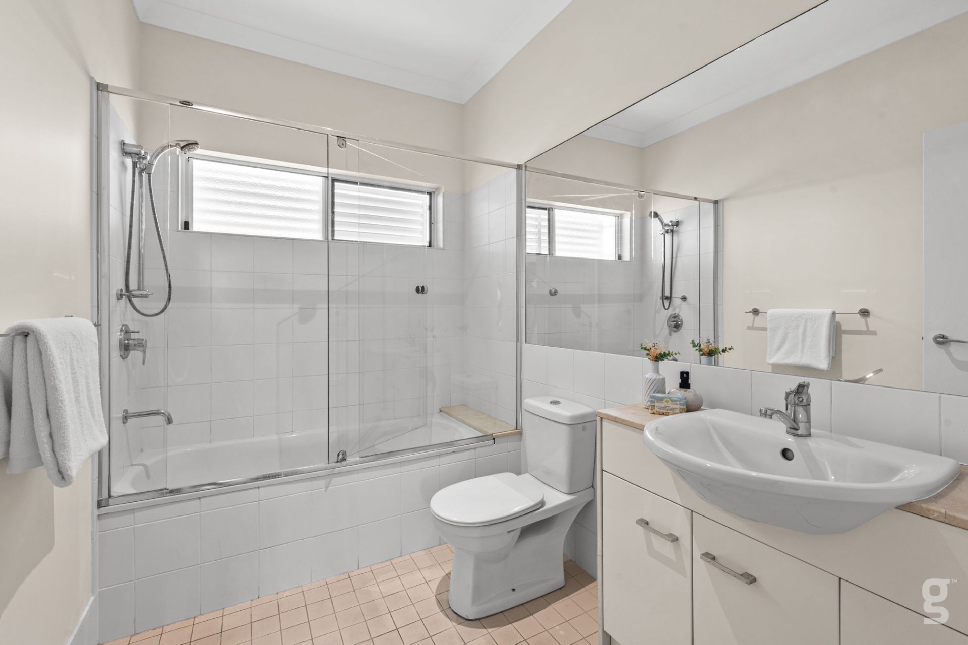 Main bathroom with shower over bath and a hideaway laundry