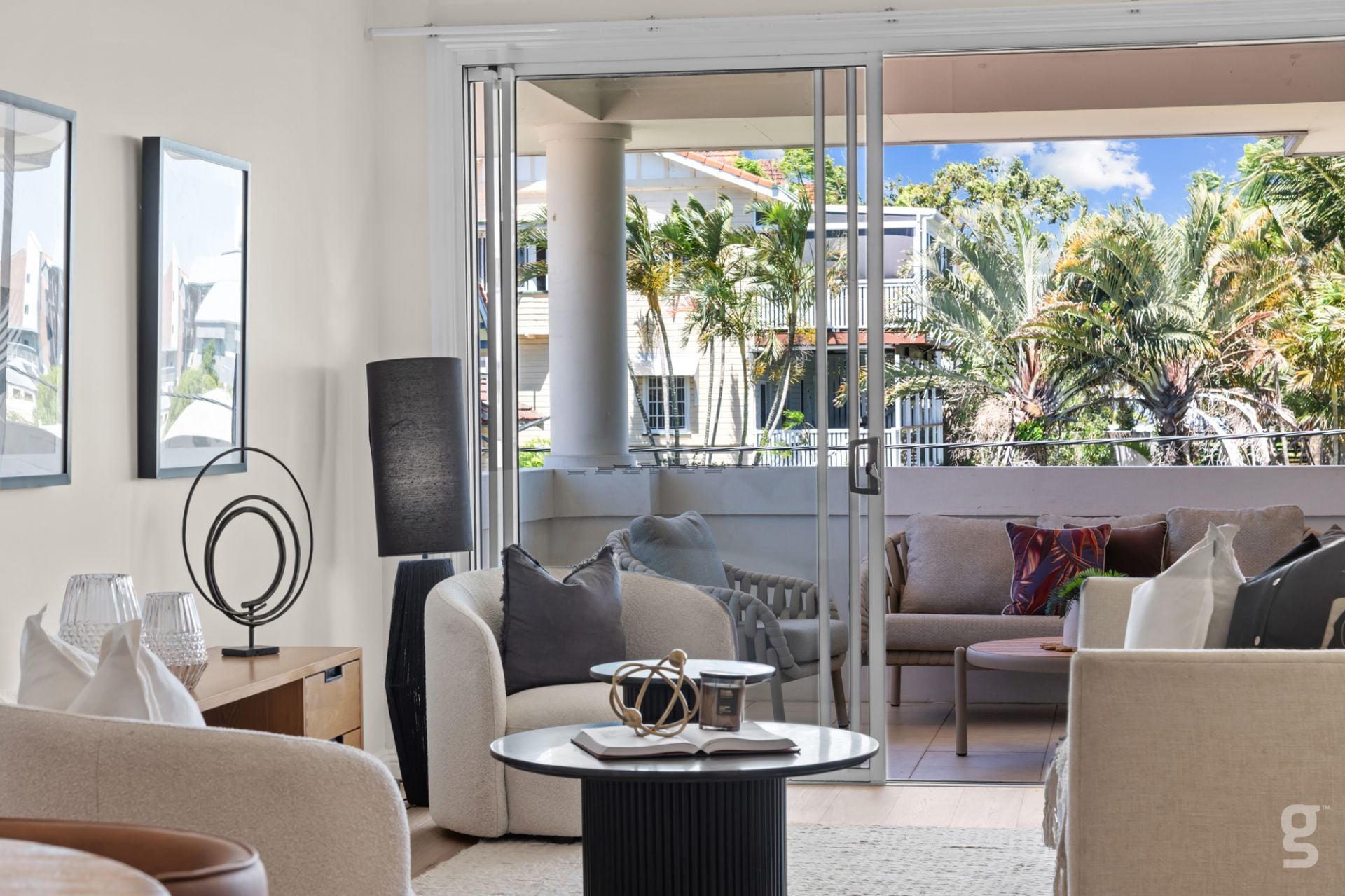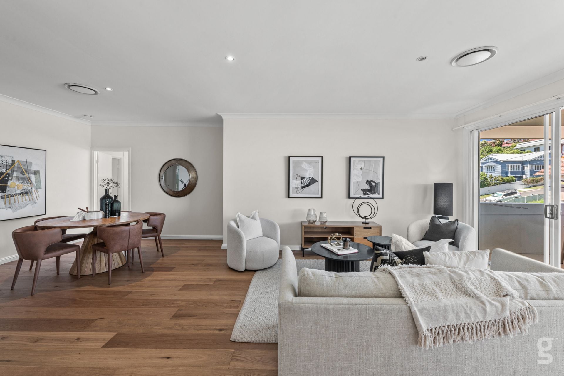 Open-plan living and dining opening onto a large private east-facing balcony